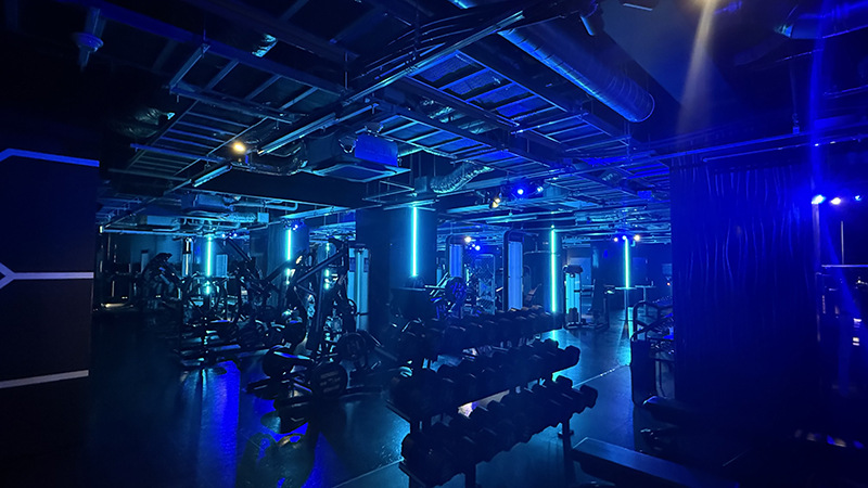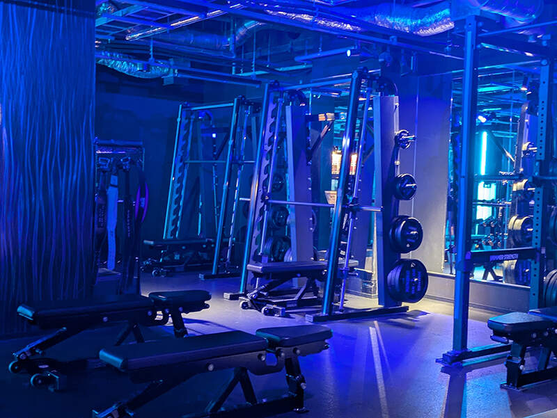 トレーニングウエアに着替えてジムに向かうと、見えてきたのは、薄暗い中に青い光でライトアップされた空間!