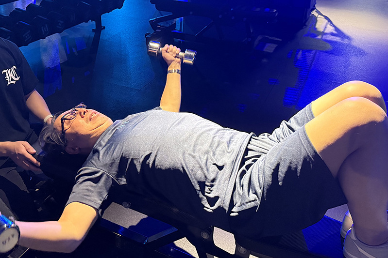 最初は調子良く持ち上げたもの、次第に腕が重くなっていくが、15回を3セット、なんとかこなした……。