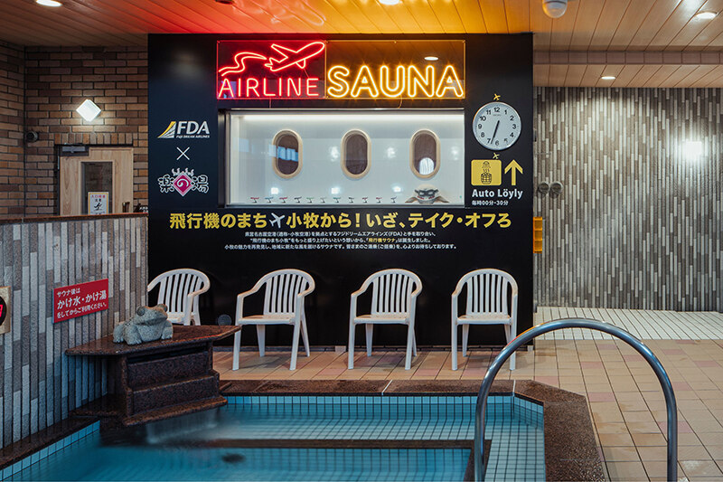 こちらの露天風呂からは飛行機が見えるということで、それなら飛行機を感じるサウナを作ろうとなったという。