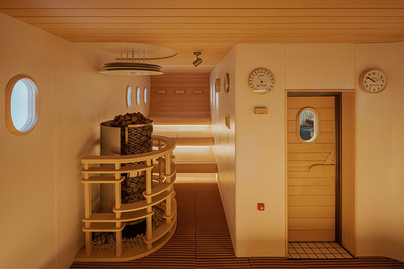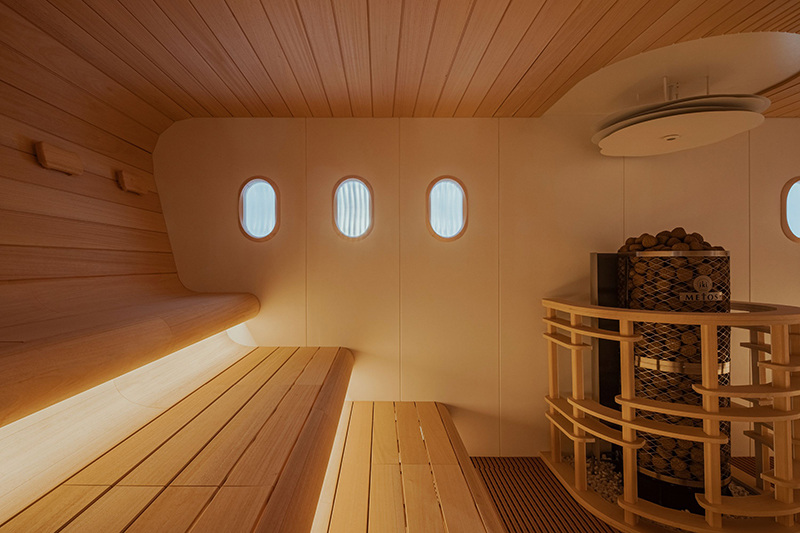 飛行機サウナのサ室は、なだからな曲線を描く天井、飛行機のような丸い窓、シートを模したベンチなど、飛行機らしさを徹底的に追及。
