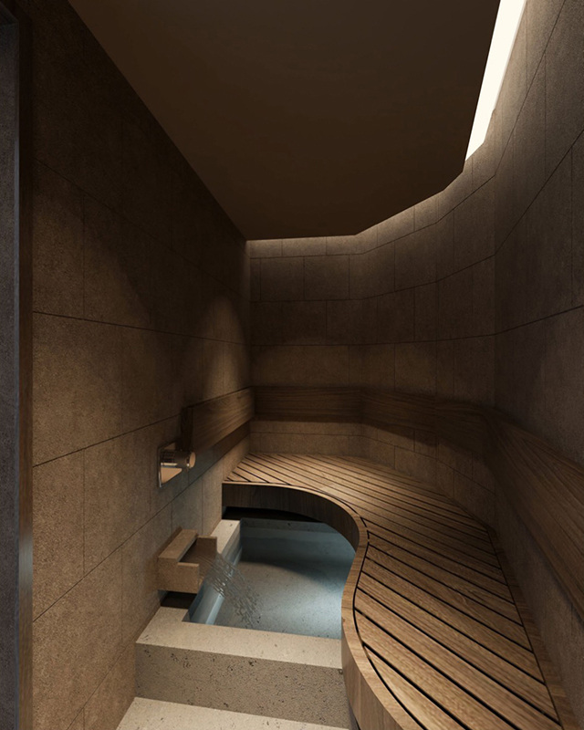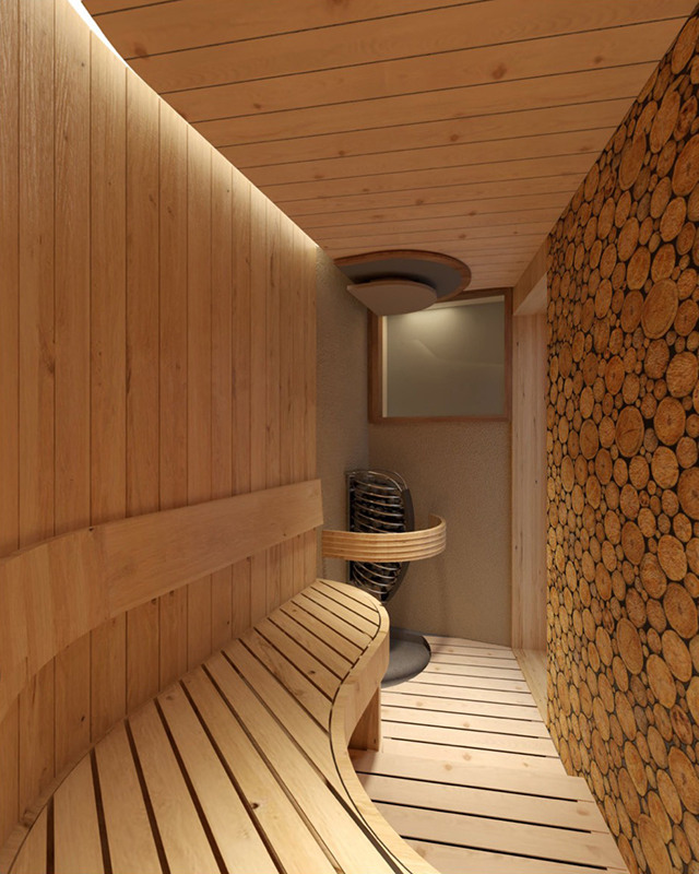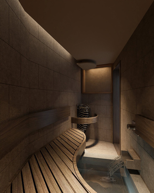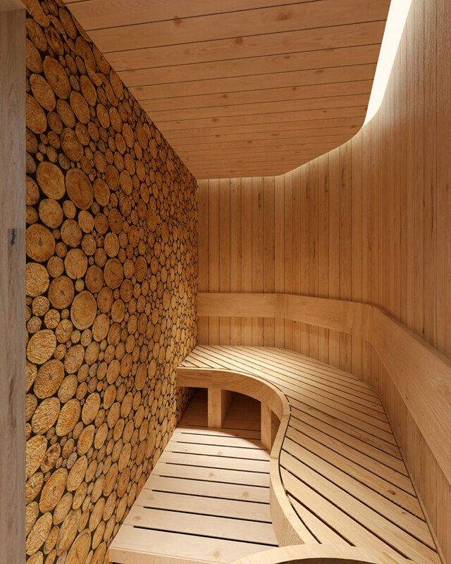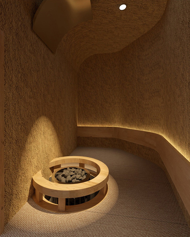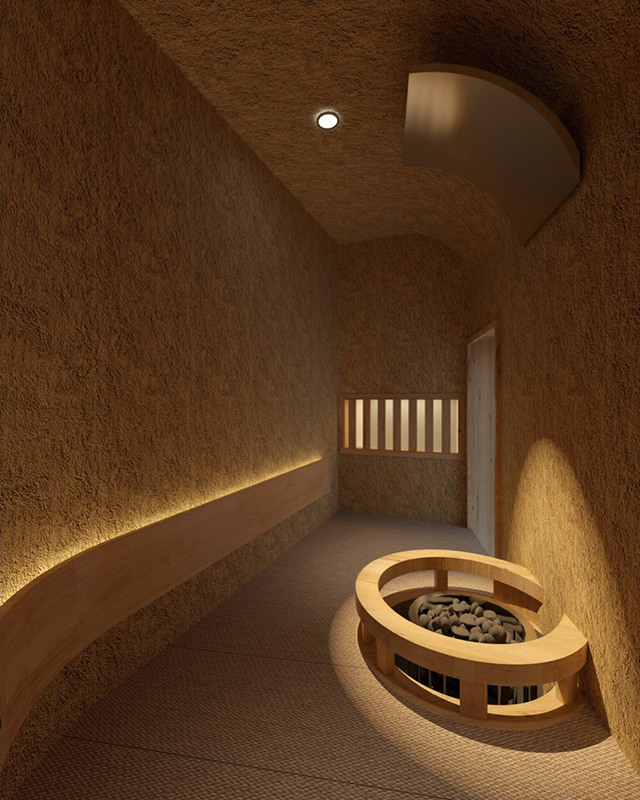 木の香りがやさしく広がるこのサウナは、森林をイメージして設計されている。