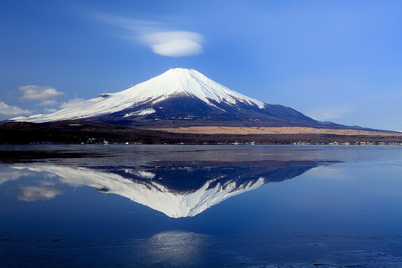 湖越しに臨む富士山の姿はまさに圧巻。実際に見た時の感じるその大きさといったら、言葉を失うほどの迫力だ。