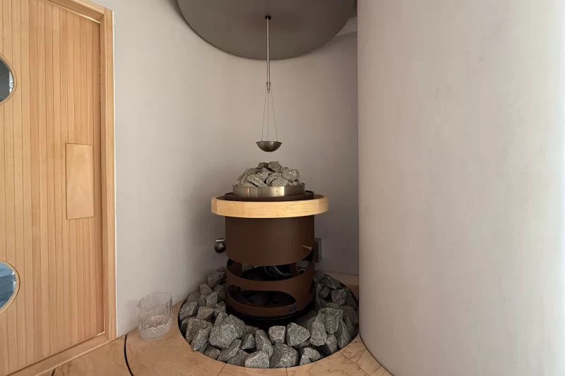 こちらがストーブ。ストーンの上部にあるカップにはイカ墨エキスから作られたロウリュ水が。