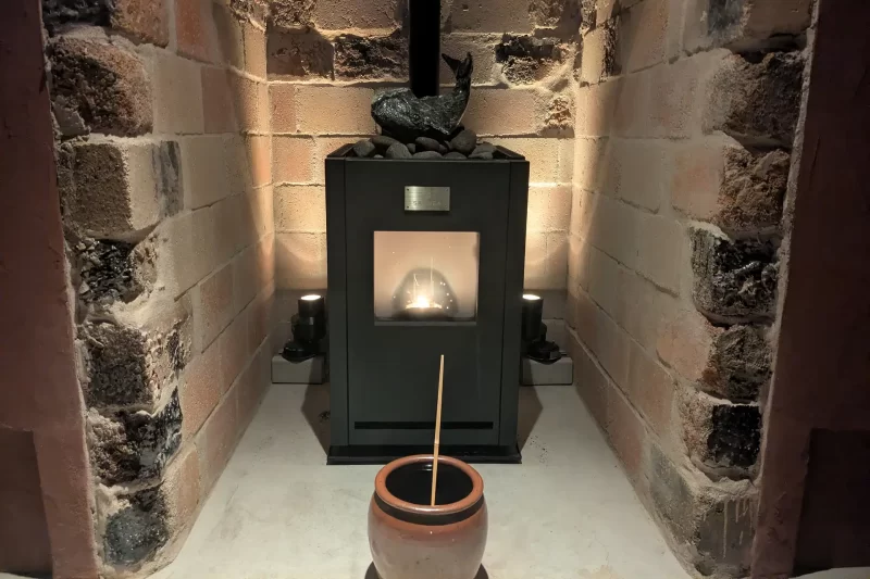 唐津焼の窯で実際に使用されていたレンガと阿蘇の黄土に唐津の土を混ぜ合わせて仕上げたサウナです。
