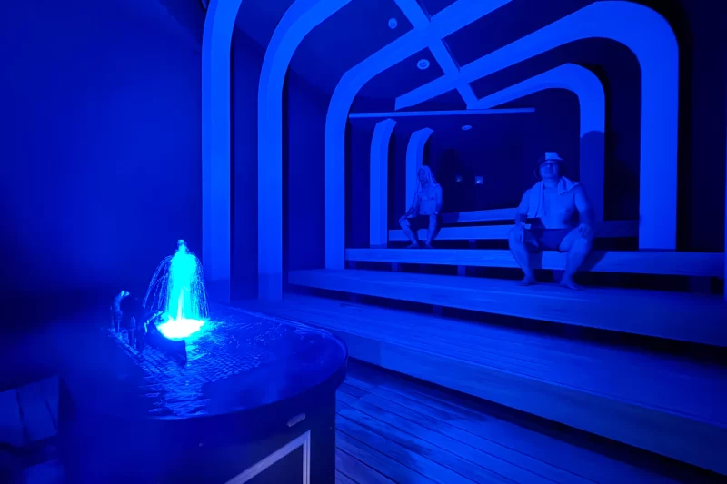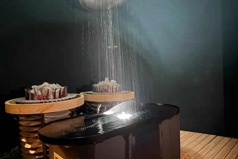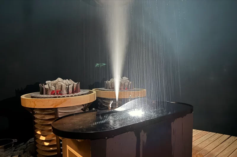 ん? 噴水に何やら動きが……と思った直後、水が一気に噴出。まさにクジラの潮吹きのようなオートロウリュだと喜んでいた記者が甘かった。