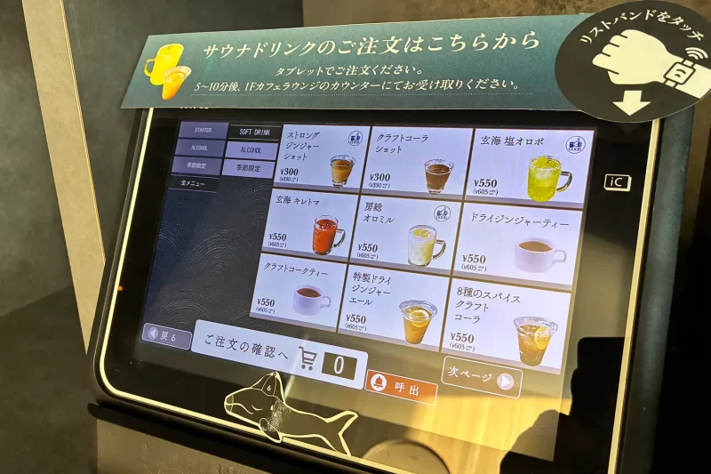 ドリンクのオーダーはフロントだけでなくサウナ内でもOK。