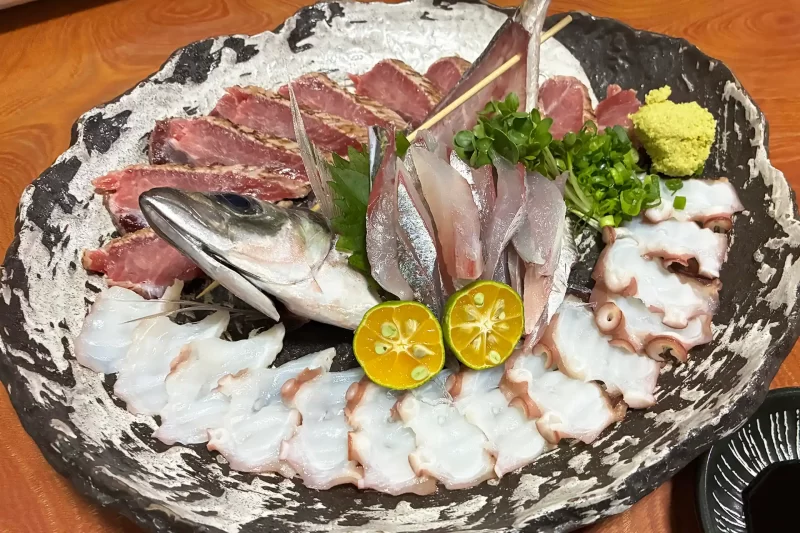 新鮮なお刺身の盛り合わせ。中央のアジは身が引き締まっていて、まったく臭みがありません。
