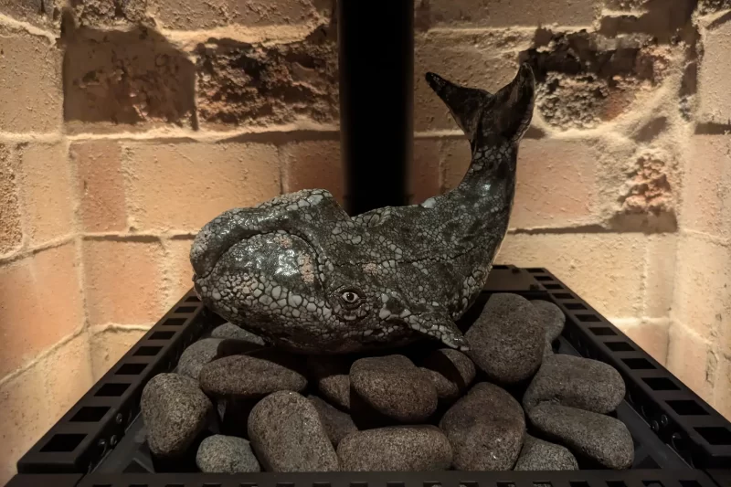 ストーブのストーンの上にはクジラの置物があり、唐津茶のセルフロウリュを楽しめます。
