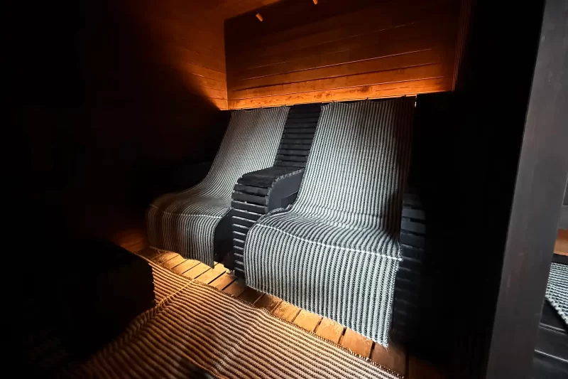 こちらが「KUROMUTA トンバイサウナ」。シックな色合いがとても落ち着く。ゆったりとした背もたれのあるスペースもあり、時間をかけて汗を出したくなる