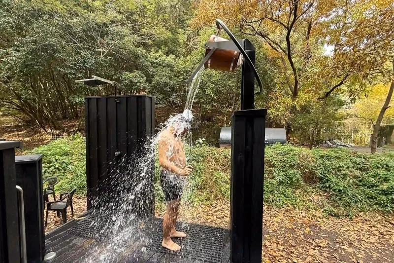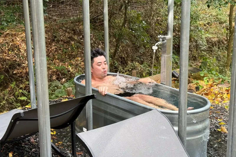 水風呂は天然水を使用。大自然の中で浴びると、また格別の気持ち良さ。この日はととのいタイムで雨に見舞われたが、それもまたよいものなのだ!
