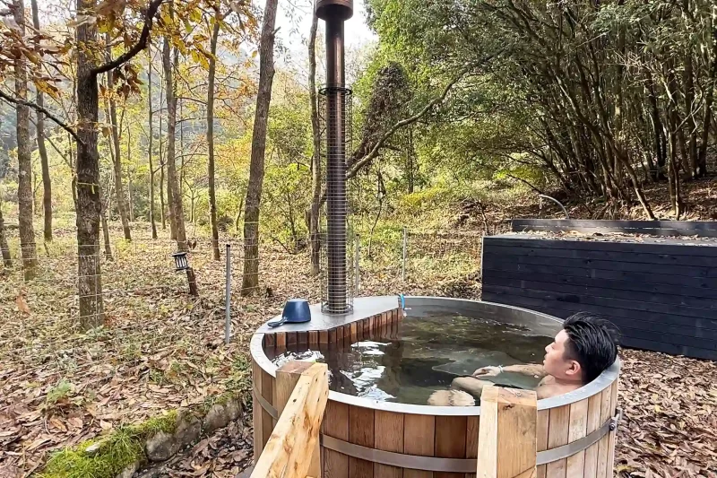 木々の中にぽつんとたたずむバレルサウナ――火のサウナ。窓の外の木々、雨が叩く音、風の音、自然をじっくりと体感する